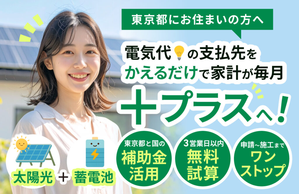 東海エコライフでは、東京都にお住まいの方向けに「太陽光発電+蓄電池」の導入で電気代を実質的に軽減し、毎月の家計を“プラス”にできるプランをご紹介しています。